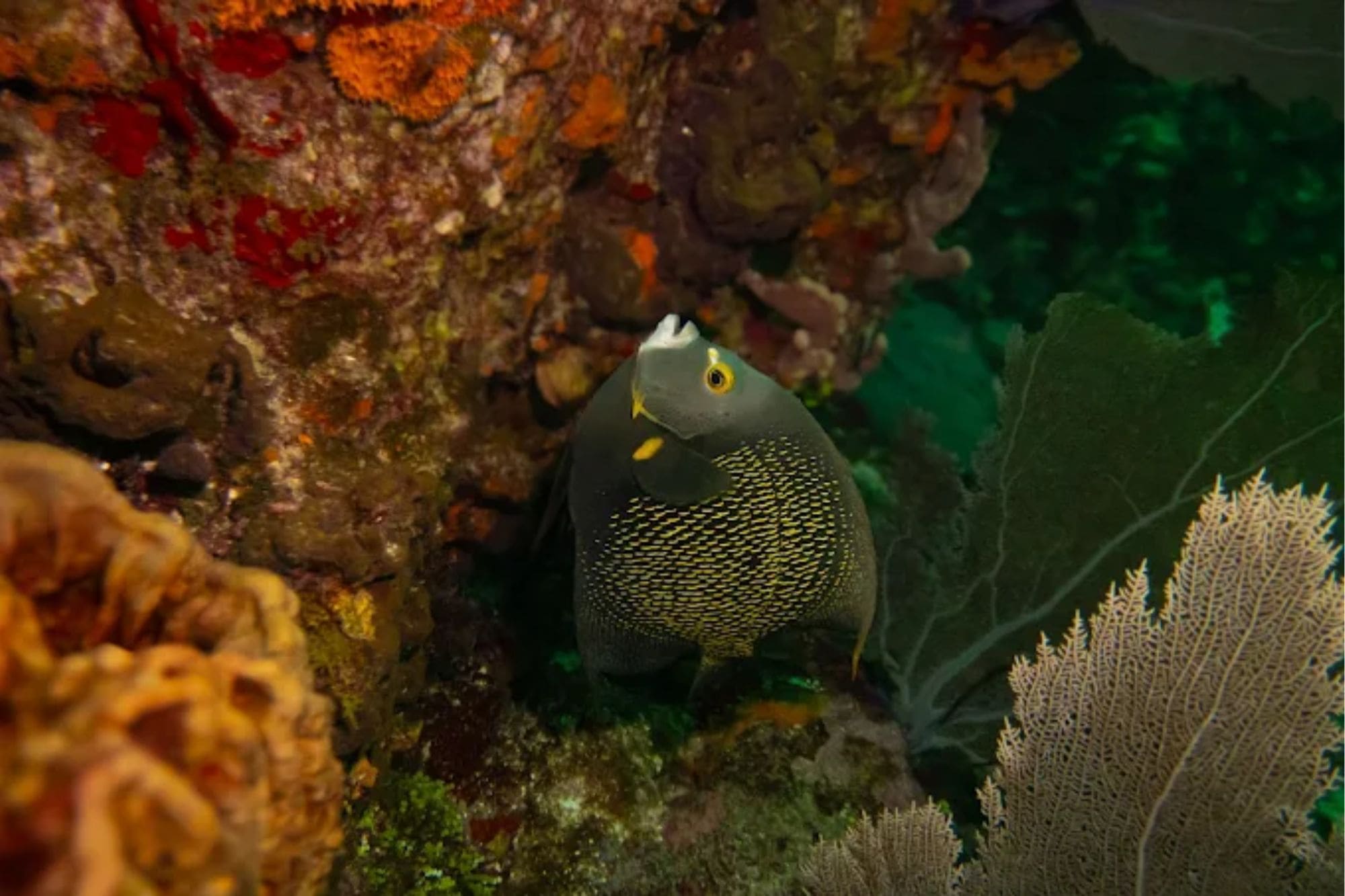 Barracudas, Pargos de gran tamaño, Meros, Langostas, Morenas Verdes y Moteadas, Tiburones Nodriza y de arrecife, Rayas Águila y peces de arrecife como Mariposas, Ángeles, Loros, Creoles y Cirujanos te acompañarán en estas inmersiones en mar abierto.